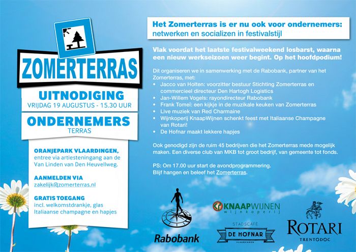 Ondernemers zijn van harte uitgenodigd voor het nieuwe Ondernemersterras op het Zomerterras! Op vrijdagmiddag 19 augustus om 15.30 uur netwerken en socializen in festivalstijl. Georganiseerd door het Zomerterras, i.s.m. de Rabobank, KnaapWijnen, Rotari en De Hofnar. Toegang is gratis, incl. welkomstdrankje, glas Italiaanse Champagne en lekkere hapjes. Aanmelden via zakelijk@zomerterras.nl